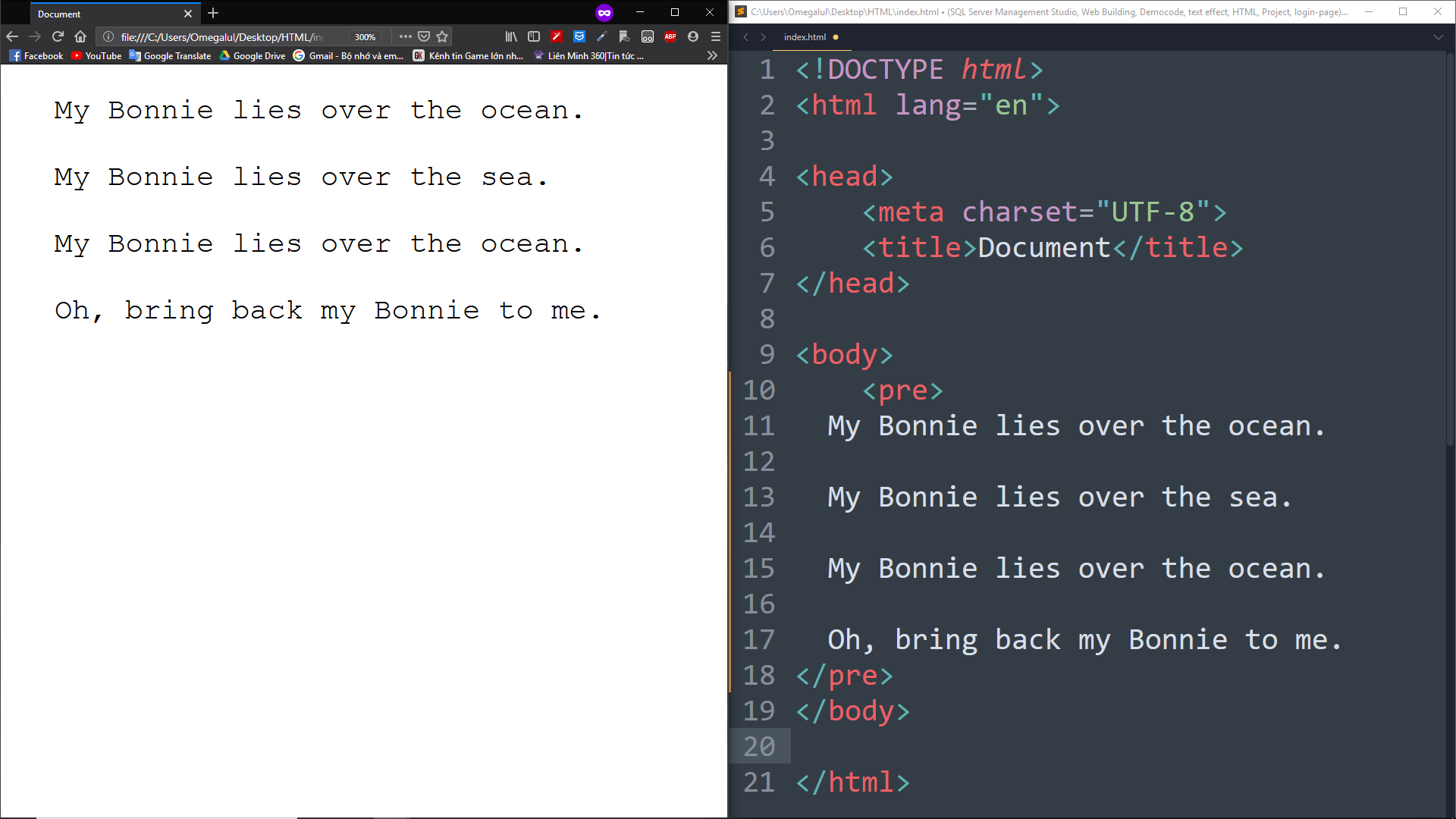 Văn bản bên trong phần tử <pre> sẽ được hiển thị với một font có động rộng cố định (thường là Courier), và nó giữ nguyên các khoảng trắng và ngắt dòng: