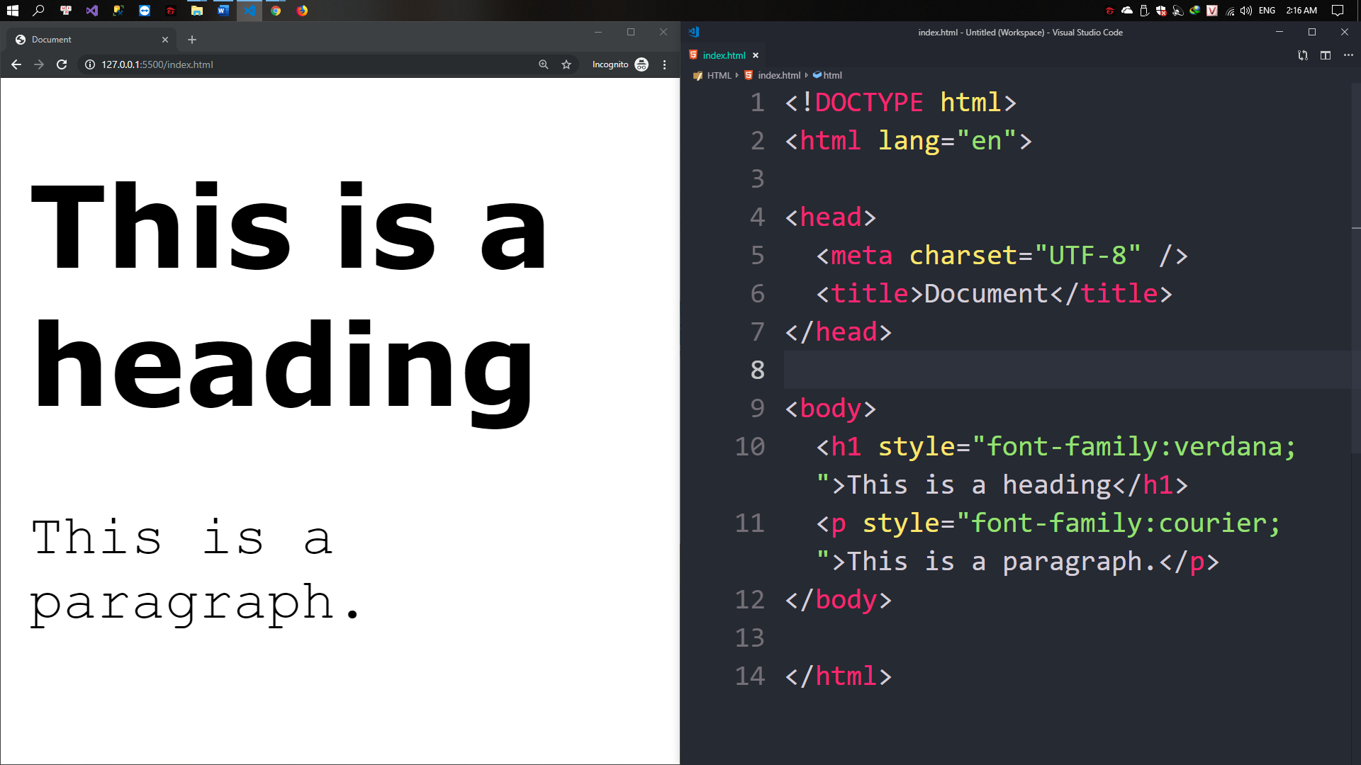 <h1 style="font-family:verdana;">This is a heading</h1>