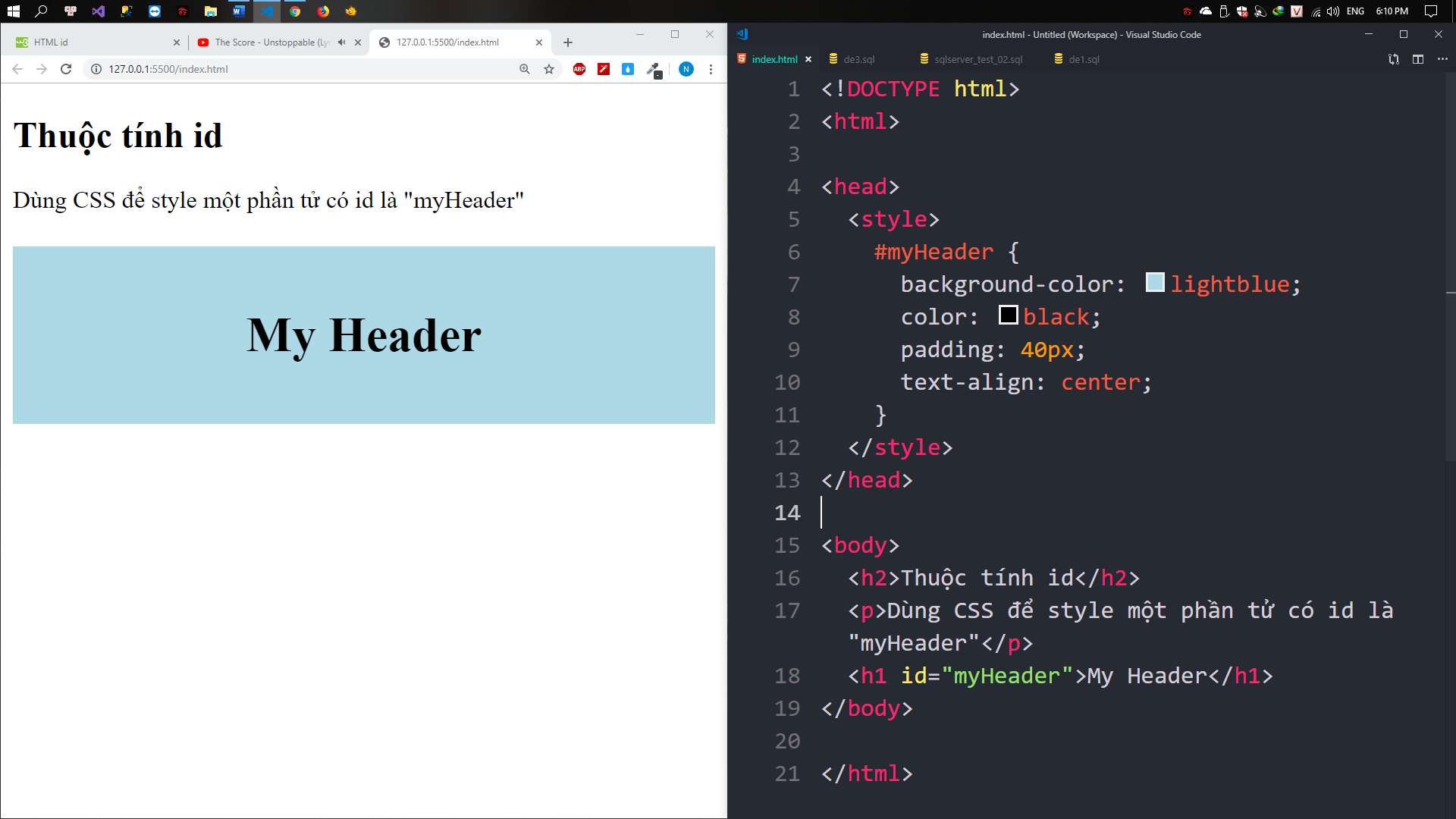 Note: Thuộc tính id có thể được dùng trên mọi phần tử HTML. Tên id phân biệt chữ hoa, chữ thường. Giá trị id phải gồm ít nhất một ký tự, và không được phép chứa khoảng trắng (dấu cách,tab, v.v)