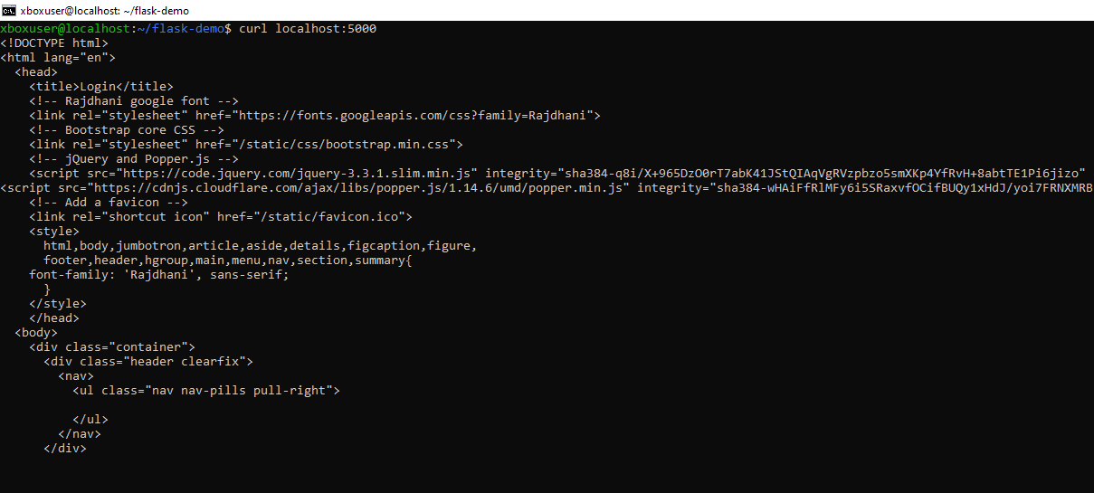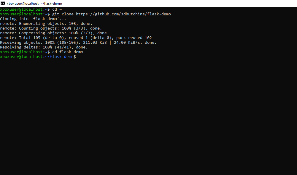 cd ~ git clone https://github.com/sdhutchins/flask-demo cd flask-demo