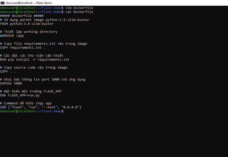 ##### Dockerfile ##### # Sử dụng parent image python:3.9-slim-buster FROM python:3.9-slim-buster # Thiết lập working directory WORKDIR /app # Copy file requirements.txt vào trong image COPY requirements.txt . # Cài đặt các thư viện cần thiết RUN pip install -r requirements.txt # Copy source code vào trong image COPY . . # Khai báo thông tin port 5000 cho ứng dụng EXPOSE 5000 # Đặt biến môi trường FLASK_APP ENV FLASK_APP=run.py # Command để khởi chạy app CMD ["flask", "run", "--host", "0.0.0.0"]
