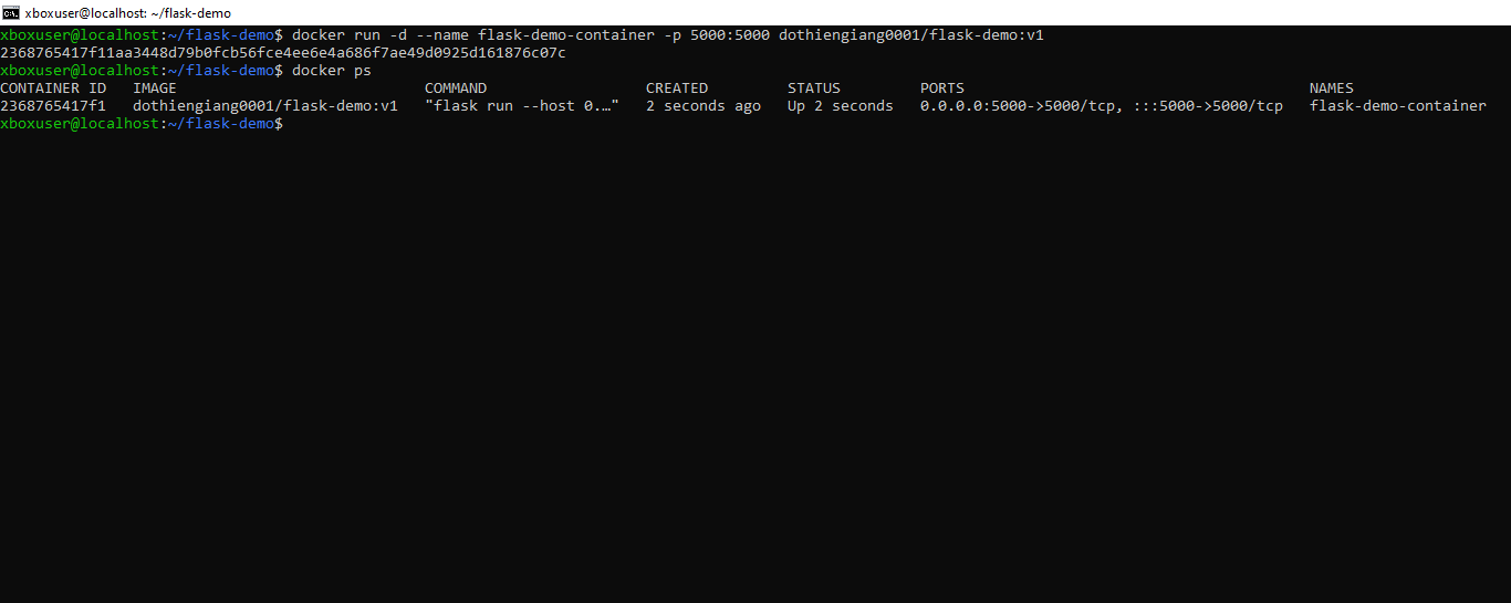 # chạy với tên container tên flask-demo-container qua image dothiengiang0001/flask-demo:v1 docker run -d --name flask-demo-container -p 5000:5000 dothiengiang0001/flask-demo:v1 # kiểm tra container docker ps