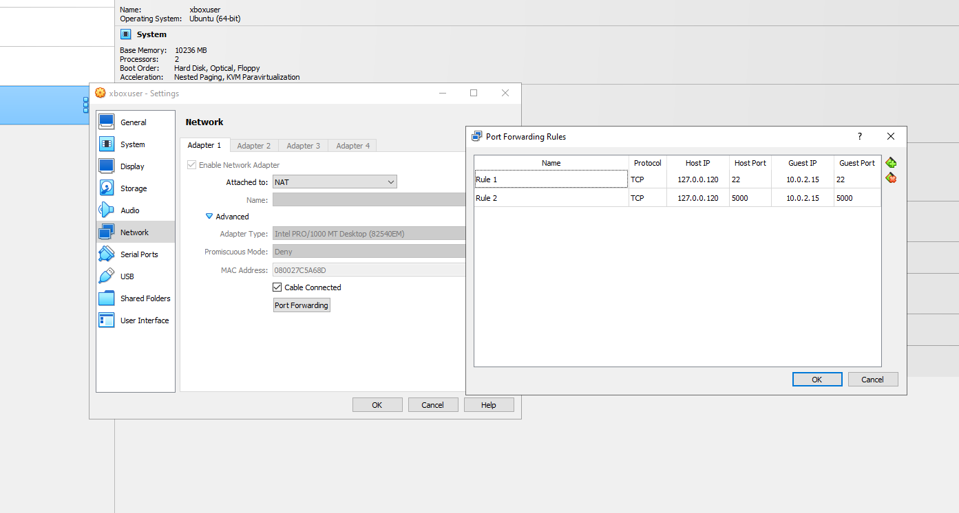 Thực hiện mở cổng kết nối qua Virtual Box: