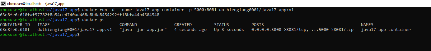 # chạy với tên container tên java17-app-container qua image dothiengiang0001/java17-app:v1 docker run -d --name java17-app-container -p 5000:8081 dothiengiang0001/java17-app:v1 # kiểm tra container docker ps