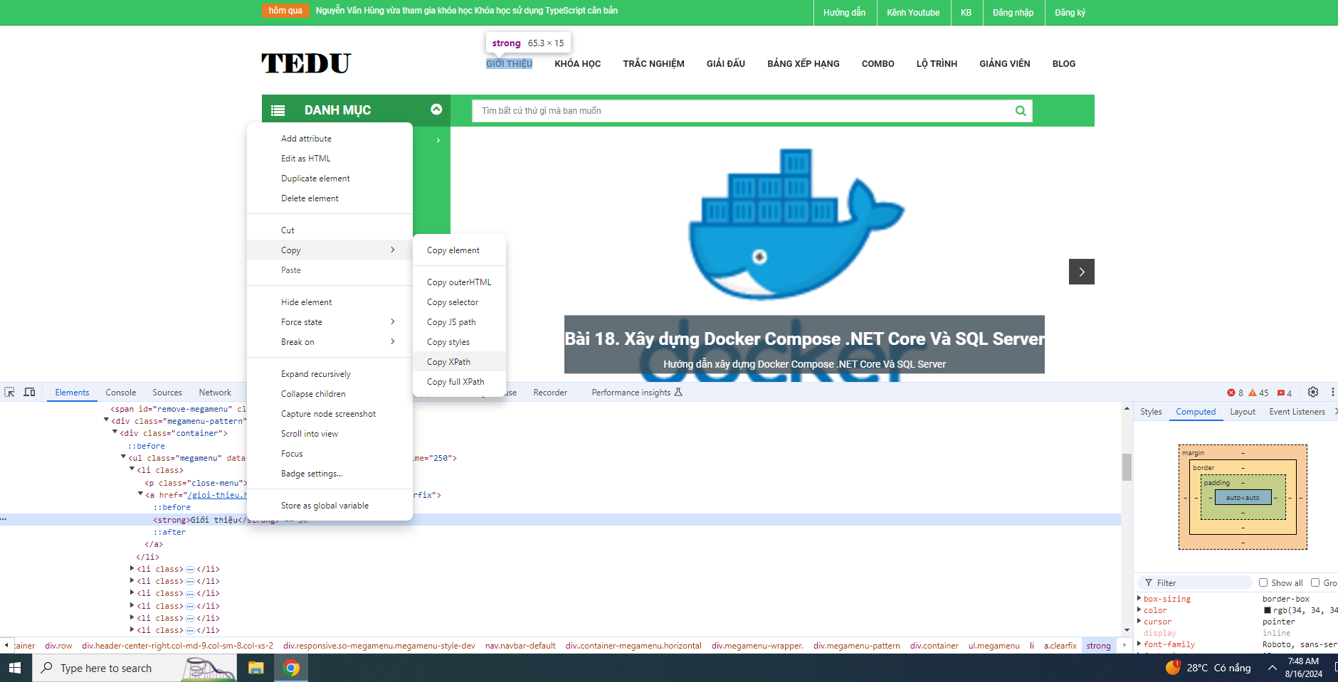 + Sau đó, Click chuột phải vào Element (danh mục "GIỚI THIỆU") và chọn Copy, sau đó chọn Copy XPath
