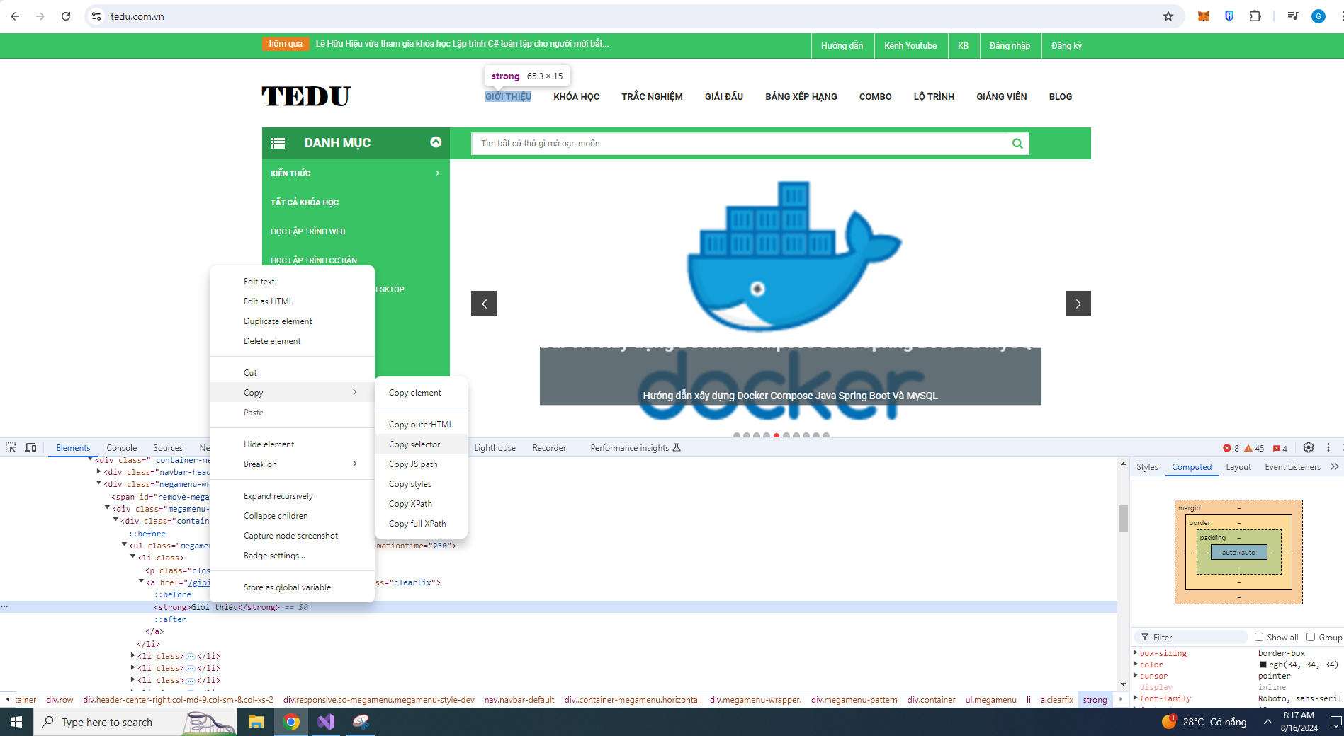 + Đầu tiên chúng ta vào trang https://tedu.com.vn/ và bật F12 để hiển thị Inspect Element lên