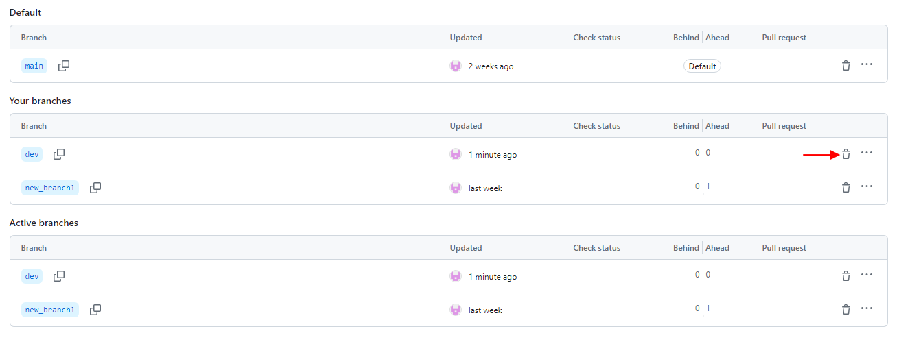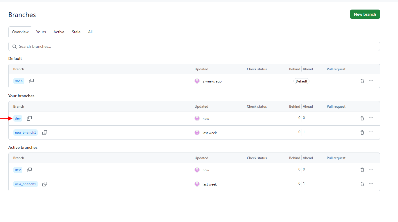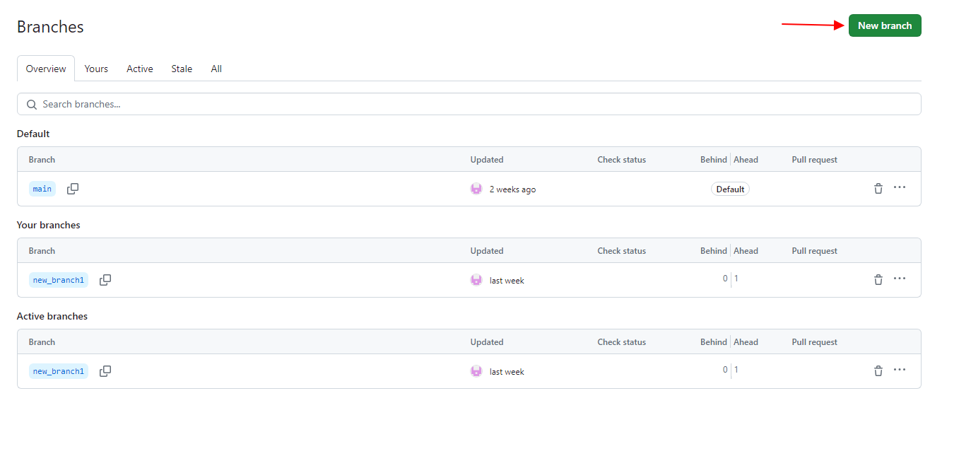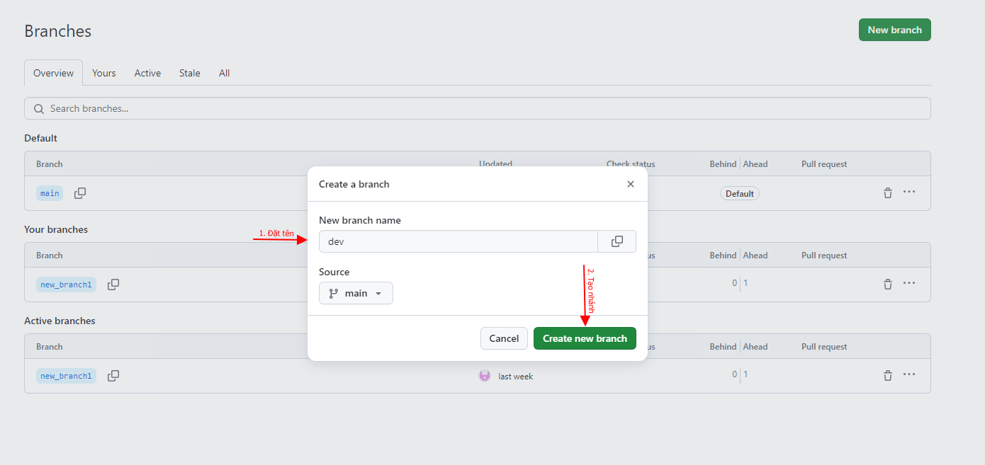 default branch: chỉ ra nhánh được đặt làm mặc định trênGitHubyour branches: nhánh mà bạn tạo raactive branches: nhánh có hoạt động, ví dụpush,pull request