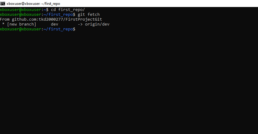 Câu lệnh fetch sẽ cập nhật thông tin metadata từ remote về local repository. Trong ví dụ này, thông tin về nhánh mới được tạo trên GitHub đã được cập nhật về local repository.