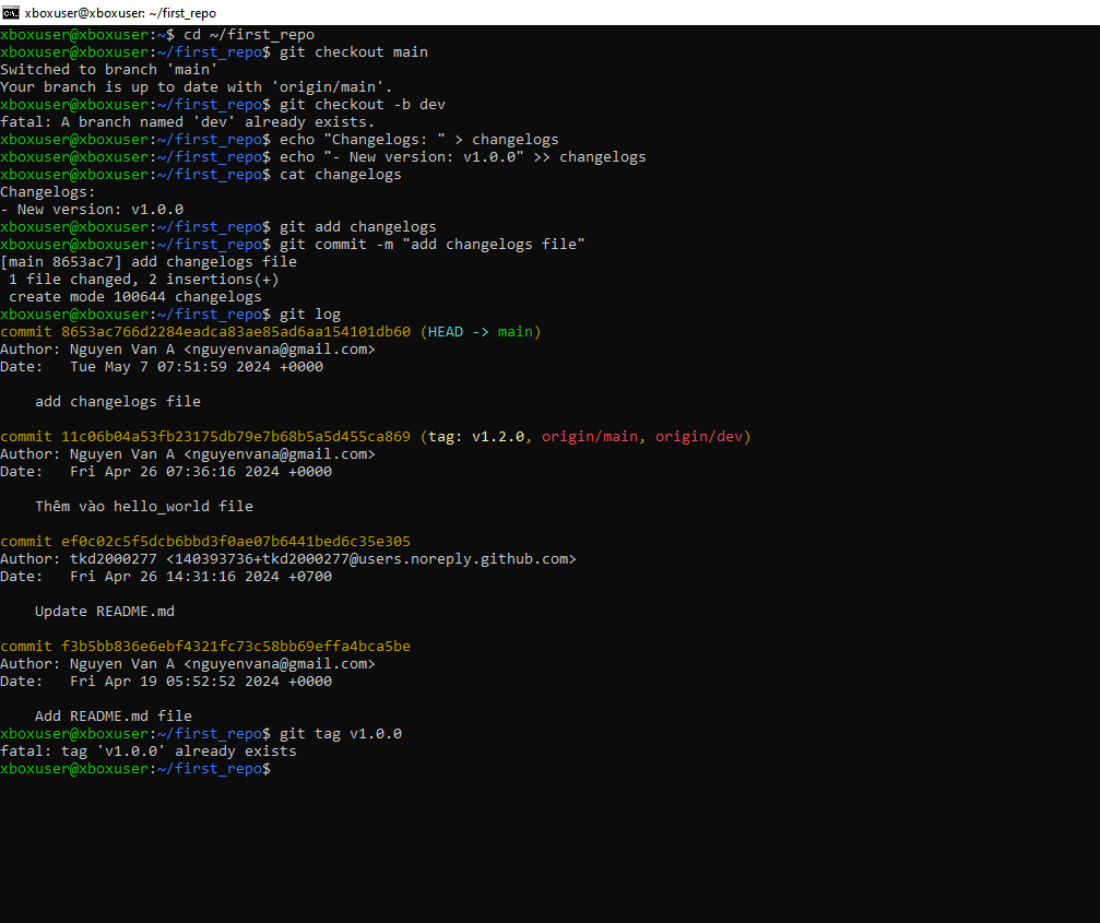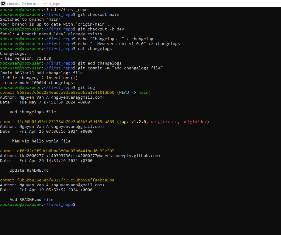 Di chuyển tới thư mục first_repo -> tạo nhánh mới dev từ nhánh main, và trên nhánh dev thêm commit mới: