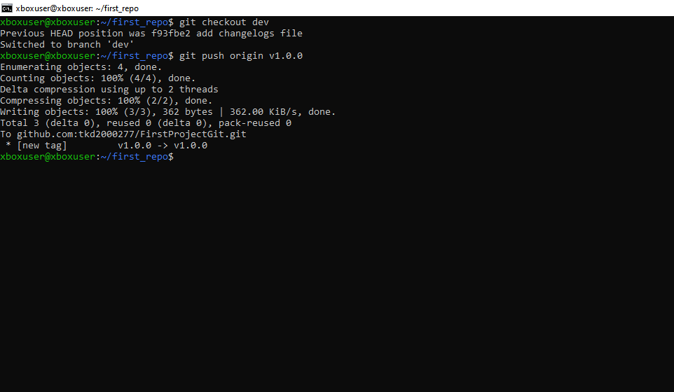 Tag giống branch ở đặc điểm cần một nhánh để xuất phát. Trong ví dụ trên, chúng ta chọn dev là nhánh để tạo ra tag v1.0.0.