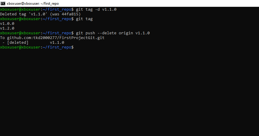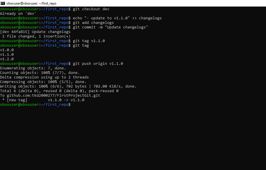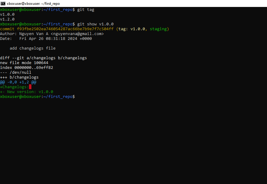 Chúng ta sẽ tạo tag v1.1.0 để ở phần cuối chúng ta thực hành câu lệnh xóa tag: