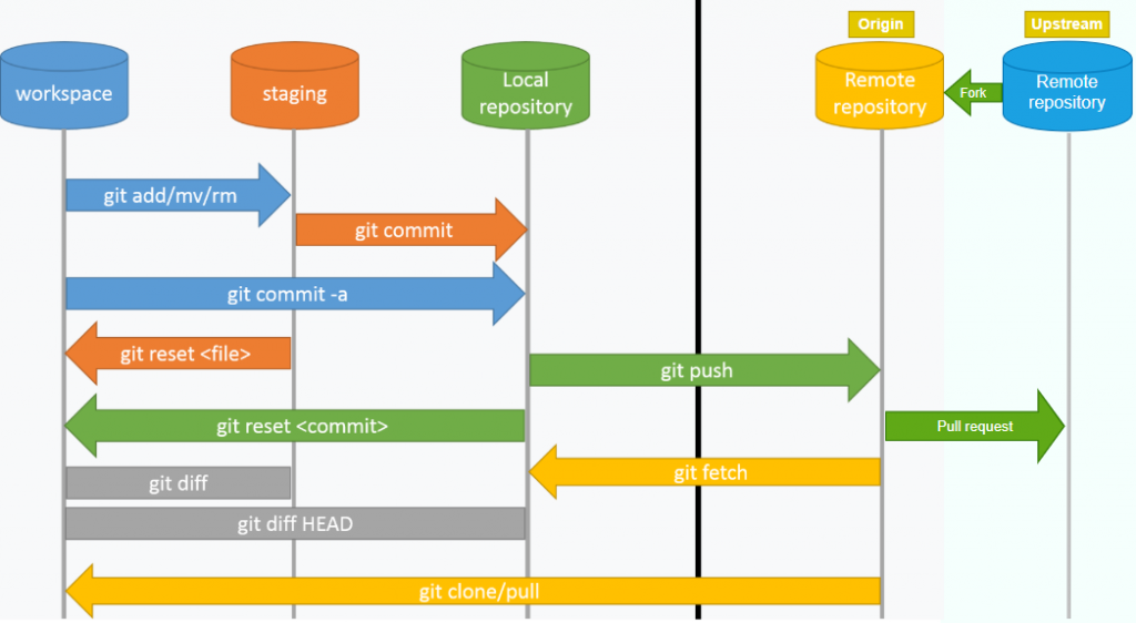 Trạng thái sau cùng là được push lên server hay chưa, cái này thì tùy nếu bạn đã add repository vào local repository thì mới cần còn không thì làm việc nguyên dưới local là đủ. Nhìn vào hình trên ta cũng thấy mỗi giai đoạn cần dùng lệnh gì trực quan phải không nào?