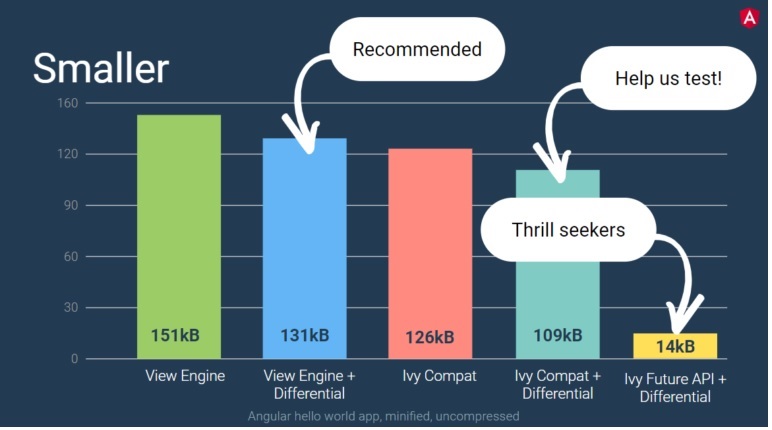 Tạo ngconf 2019, Brad Green, Techincal Director của Angular Team tạo Google nói Ivy sẽ có một cải tiến đáng kể liên quan đến kích thước bundle và tương thích với tính năng Differnent Loading. Chúng ta sẽ có các lợi ích sau đây khi sử dụng Ivy: