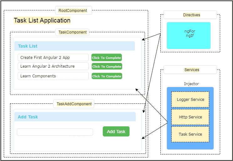 Ứng dụng của chúng ta có 3 Components. Ở trên cùng chúng ta có RootComponent. Dưới RootComponent chúng ta có 2 component một là TaskComponent sẽ hiển thị danh sách task còn một component TaskAddComponent cho phép chúng ta tạo mọto task mới.