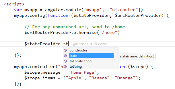 Đầu tiên bạn cần download file angular.intellisense.js sau đó vào thư mục Program Files (x86)\Microsoft Visual Studio 12.0\JavaScript\References trên máy của bạn rồi paste file đó vào thư mục này. Sau đó mở Visual Studio lên và thử đoạn code: