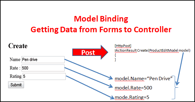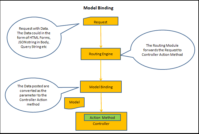 Khi người dùng click vào nút Submit thì một request Post được gửi lên server với Form Data, QueryString, Route Parameter...MVCRouteHandler của Routing Engine sẽ xử lý request đến và có trách nhiệm gọi action method tương ứng. Model Bindler sẽ được kích hoạt trước khi action method được gọi. Nó tìm dữ liệu thỏa mãn trong form data, querys tring và request parameter trong HTTP Request. Sau đso nó sẽ binding các giá trị vào tham số của action method qua tên.