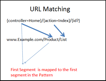 Mỗi phần trong URL request đến sẽ match tương ứng với thành phần của URL Pattern. Route {controller=Home}/{action=Index}/{id?} có 3 thành phần. Phần cuối là tùy chọn. Xem xét ví dụ URL www.example.com/product/list thì URL này có 2 thành phần. URL này vẫn match với pattern ở trên vì phần thứ 3 không yêu cầu.