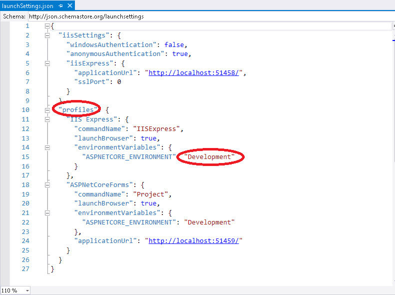 Cách khác là thay đổi biến môi trường sử dụng lauchSettings.json như dưới đây: