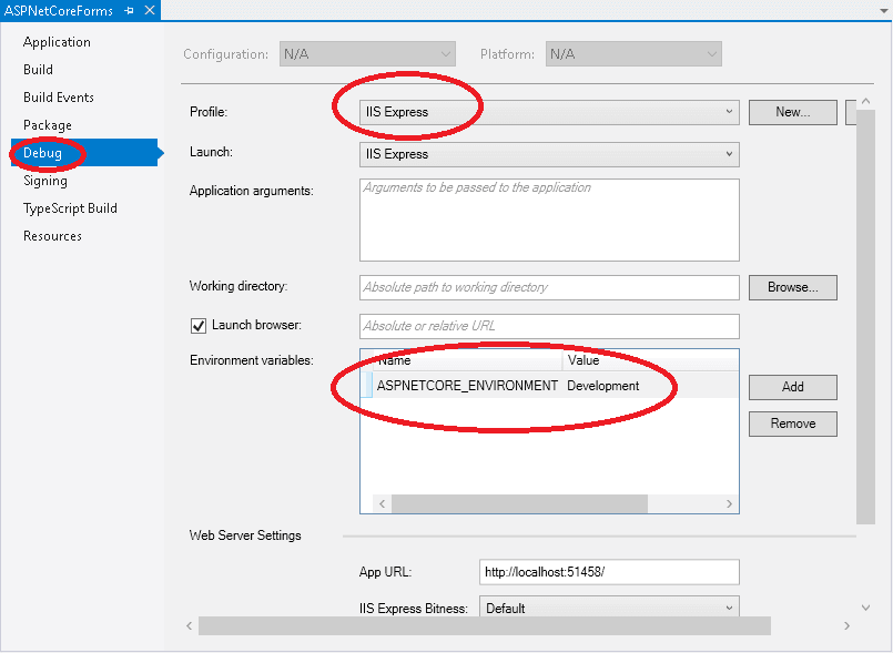 Mở Project Properties ra và chọn tab Debug. Trong phần tên biến môi trường chọn giá trị biến ASPNETCORE_ENVIRONMENT và thay đổi giá trị. Nếu tên biến là ASPNETCORE_ENVIRONMENT không tồn tại hãy click vào nút thêm mới.