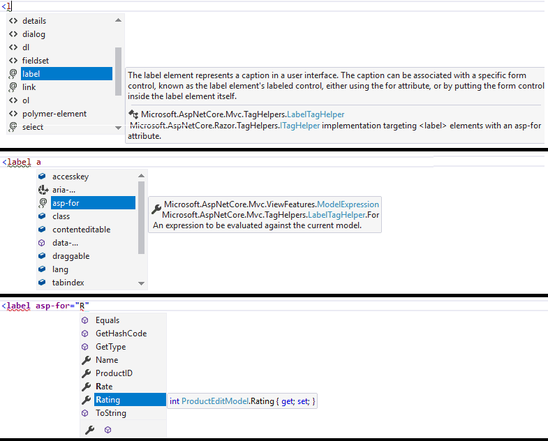 Tag Helper cung cấp sự hỗ trợ bởi cơ chế gợi ý thông minh của Visual Studio. Ví dụ dưới khi chúng ta thấy gợi ý cho label của thuộc tính Rating.