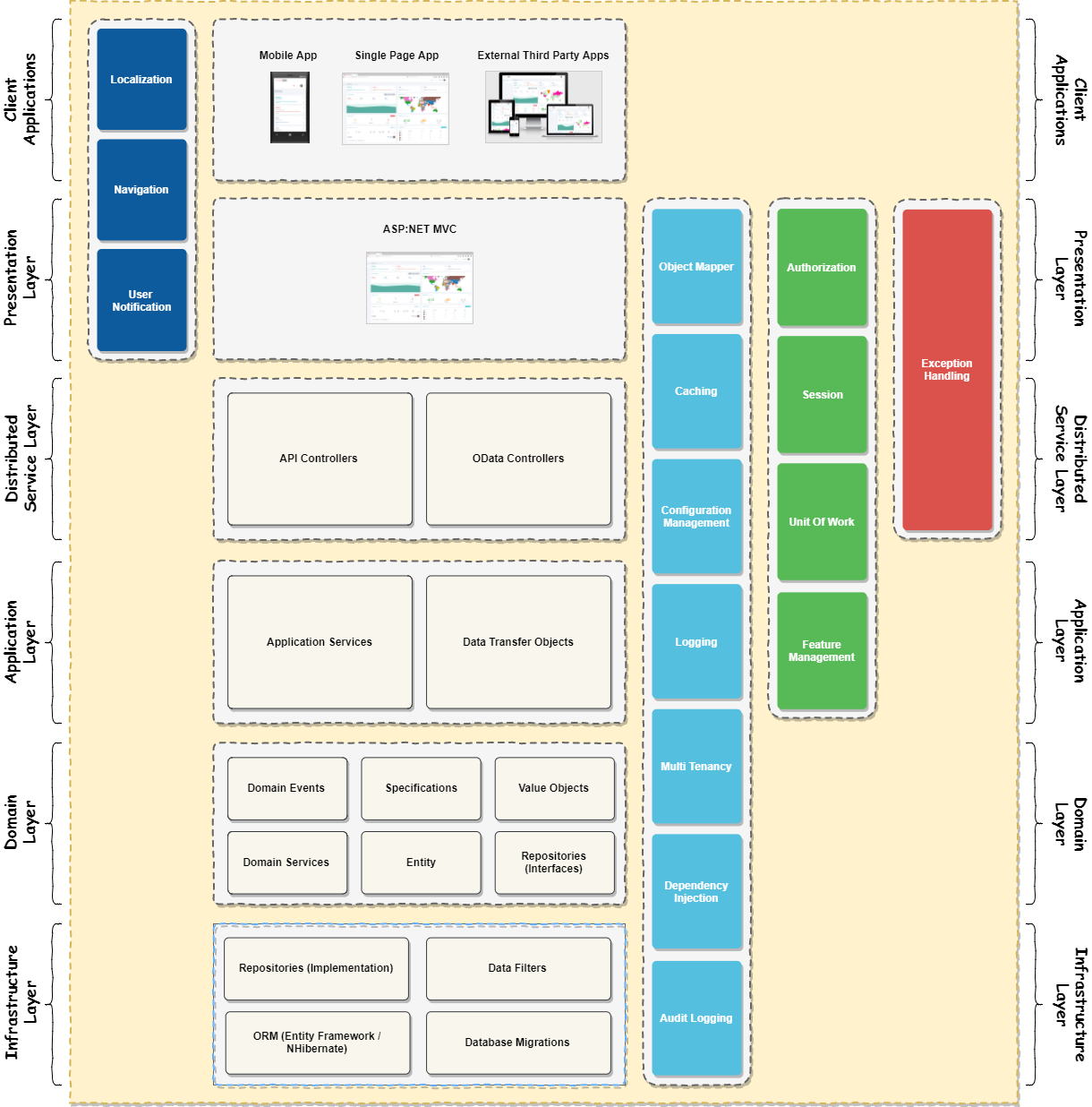 Các thư viện hạ tầng của ABP Framework được trải từ Database (các table sẵn có) và Backend đến Frontend. Nó cũng tuân theo các best practice trong triển khai phát triển phần mềm như: