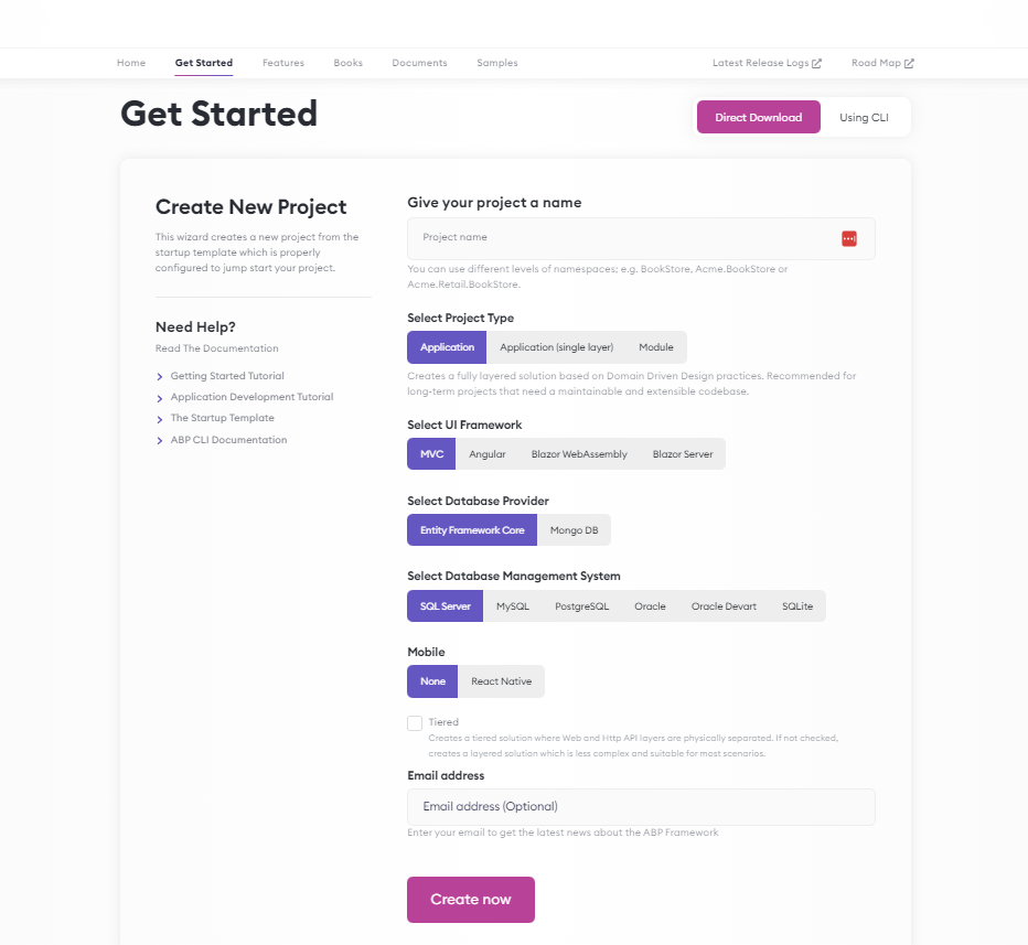Để tạo mới ứng dụng sử dụng ABP các bạn có thể truy cập: https://abp.io/get-started