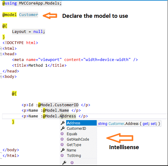 Như đã nhắc ở trên, ViewDataDictionary có một thuộc tính đặc biệt là Model, nó có thể được truy cập sử dụng ViewData. Chúng ta có thể gán Customer ViewModel về view sử dụng thuộc tính Model: