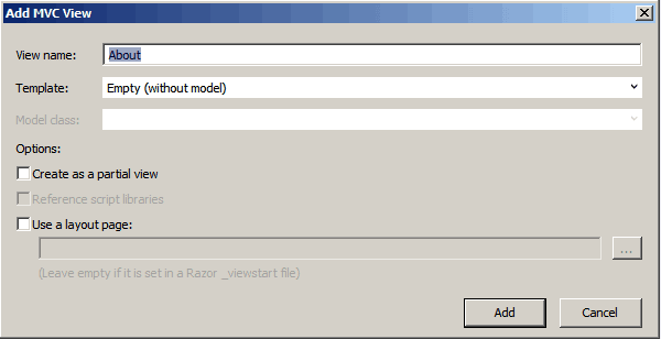 Ví dụ chọn tên view là About, và template là Empty (without model) không chọn vào Create a partial view và Use a layout page. View được tạo sẽ nằm trong thưu mục Views/Home/About.cshtml. Mở file About.cshtml ra và thêm dòng <h1>About Us</h1> vào sau thẻ tiêu đề: