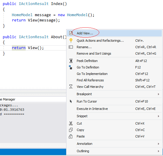 ActionResult trả về HTML là một ViewResult. Phương thức View của Controller base class trả về một ViewResult. Chuột phải vào bất cứ đâu trong phương thức và chọn Add View