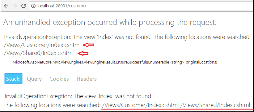 Đầu tiên là thư mục Customer với tên của controller. Nếu không thấy nó sẽ tìm tiếp trong thư mục Shared trước khi đưa ra lỗi InvalidOperationException.