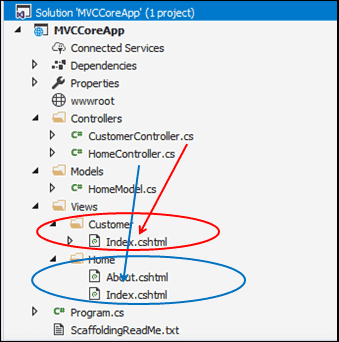 Mỗi Action method trong HomeController sẽ có một file View tương ứng như About.cshtml và Index.cshtml và lưu trong thưc mục Views/Home. Tương tự như thế, action method của CustomerController sẽ có thư mục Views/Customer.