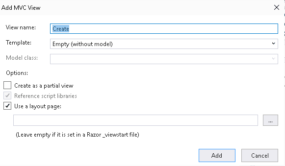 Nó sẽ tạo một file view tên là Create.cshtml trong thư mục Views.