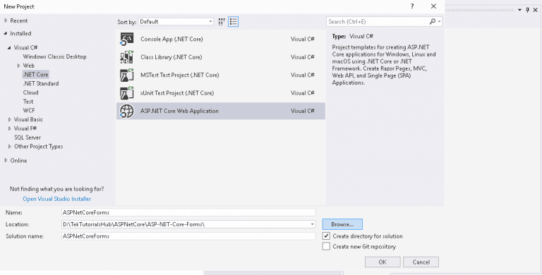 Tạo mới một project tên là ASPNetCoreForms. Chọn mẫu là ASP.NET Core Web Application template. Template này sẽ có sẵn trong phần Visual C# -> .NET Core. Tên của project đặt là ASPNetCoreForms.