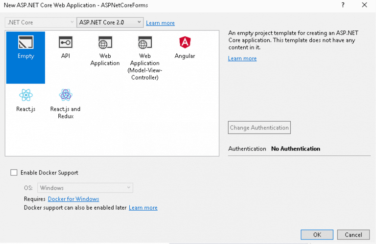 Tiếp theo chọn .NET Core và ASP.NET Core 2.2 sau đó chọn Empty template và click OK.