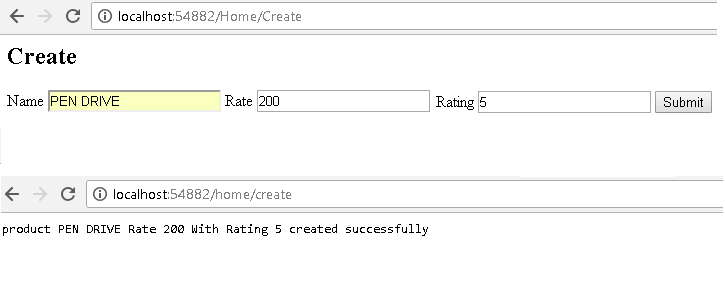 Cuối cùng hãy chạy ứng dụng. Click nút Create sau đó nó sẽ mở một form. Nhập giá trị bên dưới và click submit.