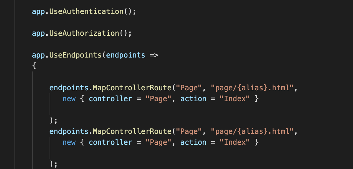- Phần cấu hình routing sẽ hoàn toàn nằm trong UseEndpoint thay vì UseMvc như ngày xưa (chúng ta có 2 cách cấu hình routing là trong từng action method tức dùng Atribute Route cách 2 là cấu hình trong Startup). Với phần rewrite URL trong MVC các bạn có thể làm như sau: