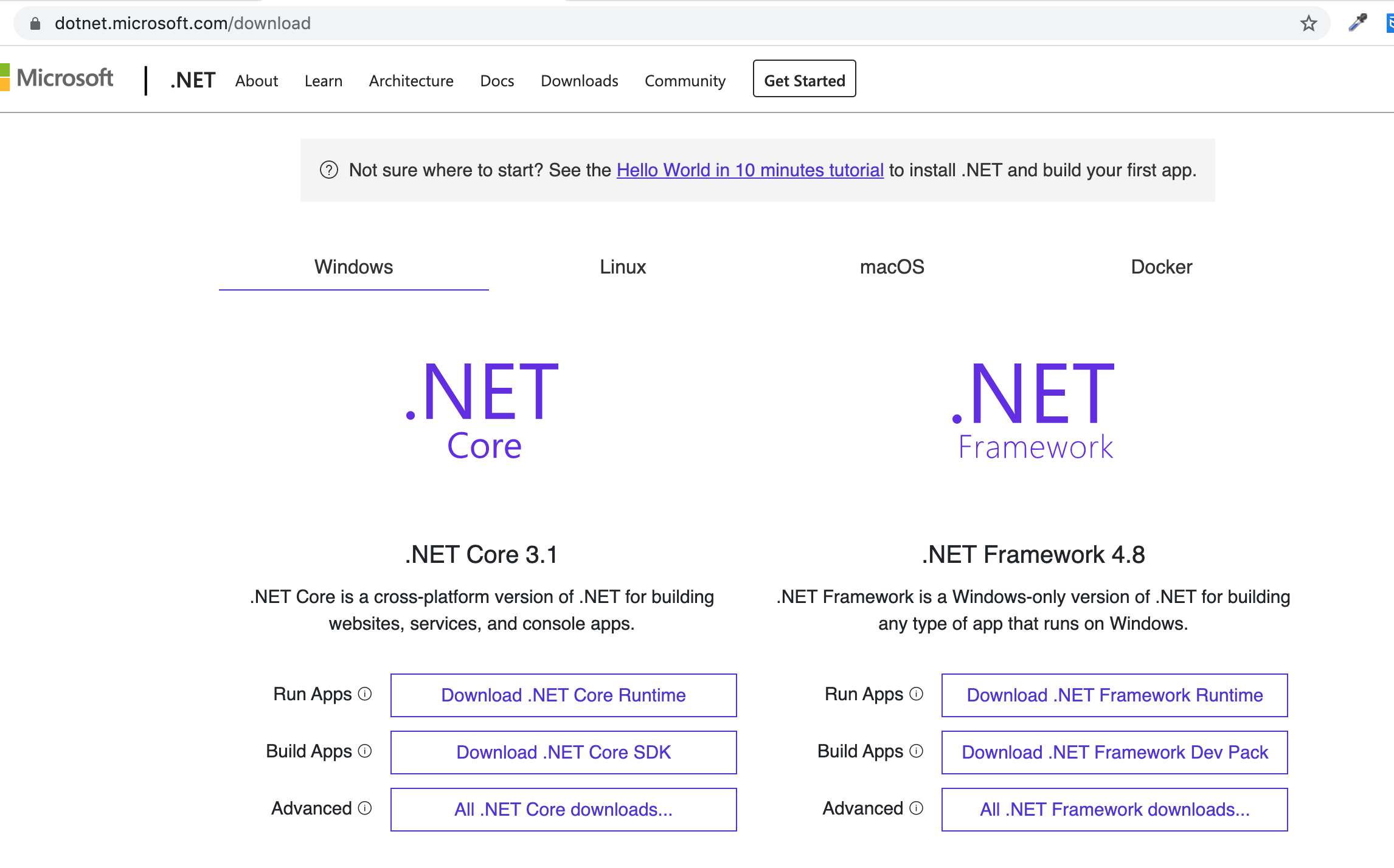 Để phát triển được chúng ta cần cài bộ SDK (Software Development Toolkit) phiên bản 3.1.100 LTS trên trang chủ: https://dotnet.microsoft.com/download/dotnet-core/3.1.
