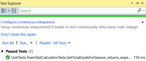 Test đầu tiên chúng ta sẽ sử dụng class TeamStatCalculator. Cụ thể là method GetTotalGoalsForSeason()