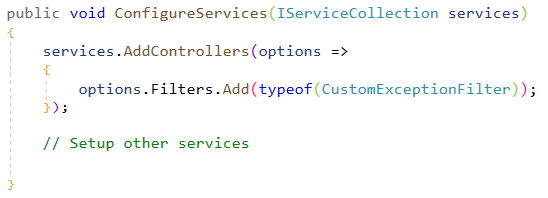 - Gắn Filter vào method ConfigureServices trong Startup.cs