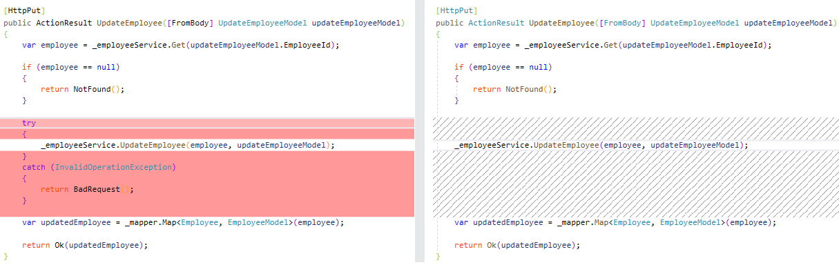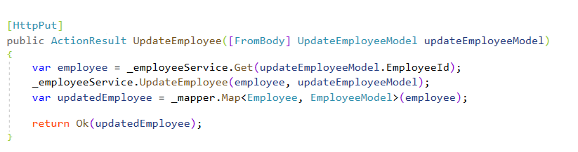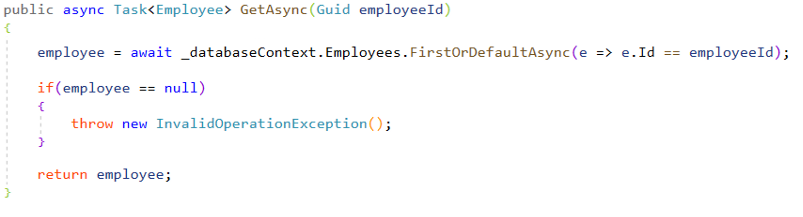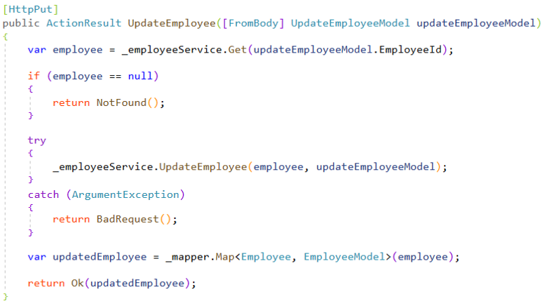 Rất đơn giản, khi ta muốn cập nhật chi tiết của Employee, có nhiều điều kiện khác nhau mà có thể xảy ra lỗi. Chúng ta có thể bắt nó ngay trong chính method này. Nhưng có vẻ nếu chỗ nào cũng code thế này thì code bị duplicate nhiều quá.