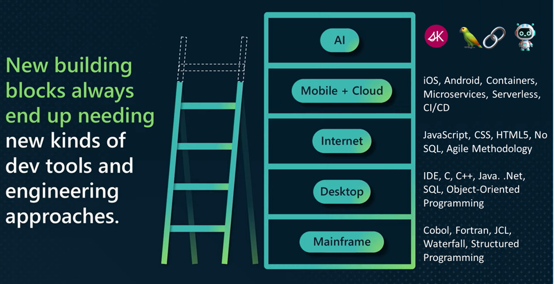 Mỗi kỷ nguyên công nghệ đều đòi hỏi công cụ và phương pháp mới (tools and methodologies). Biểu đồ dưới đây minh họa quá trình tiến hóa của kỹ thuật phần mềm qua từng tầng: