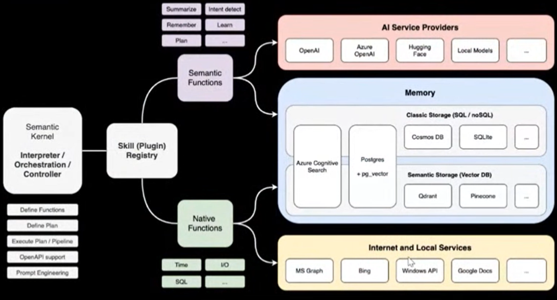 Semantic Kernel (SK) là một SDK mã nguồn mở (open-source SDK) giúp xây dựng các AI agent có thể gọi và tích hợp với mã nguồn hiện tại. Nó hỗ trợ các mô hình từ OpenAI, Azure OpenAI, Hugging Face, v.v. SK kết hợp các semantic functions (hàm ngôn ngữ tự nhiên), native functions (hàm truyền thống) và embeddings-based memory (bộ nhớ dựa trên vector embedding) để tăng cường khả năng AI.