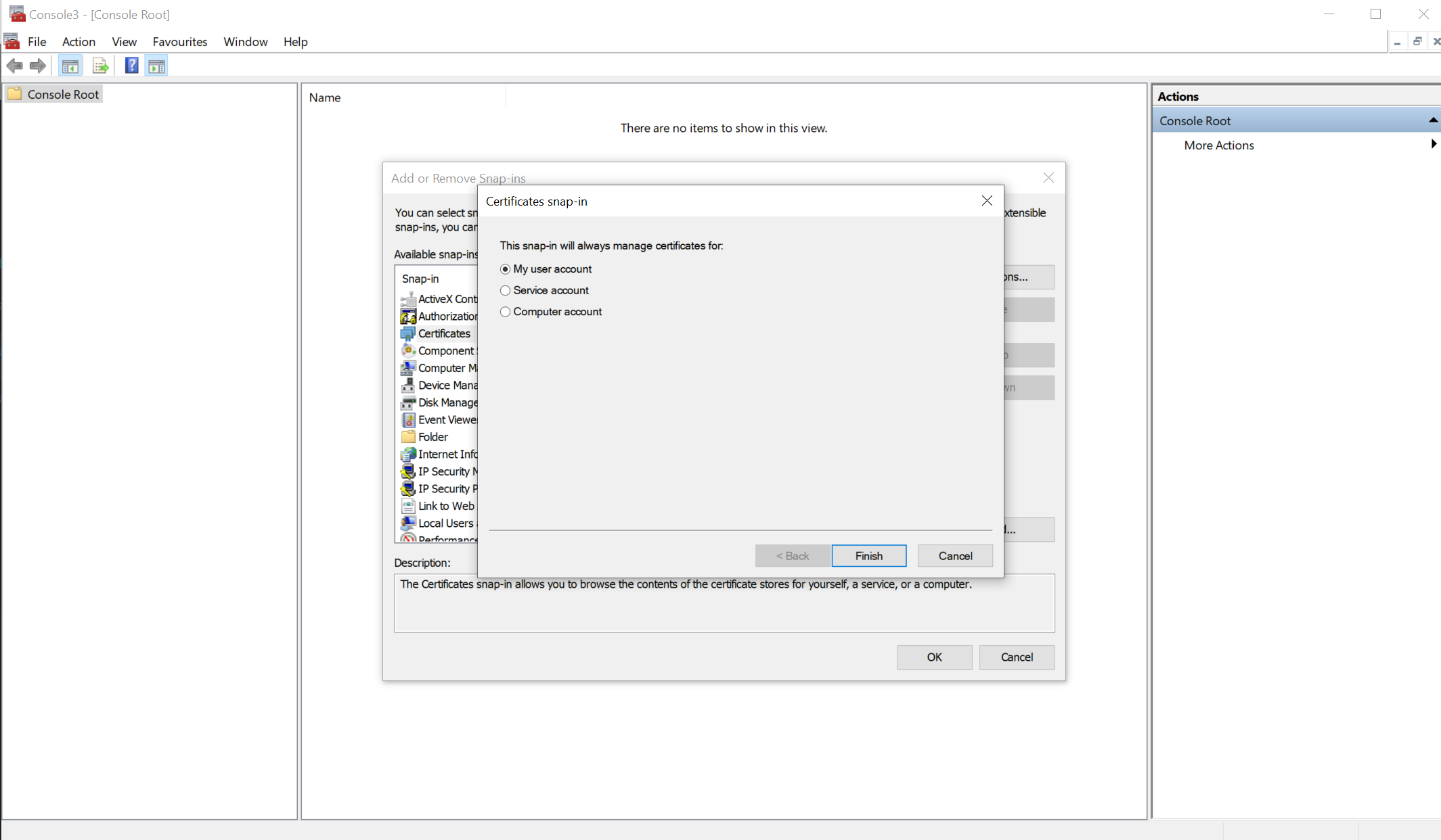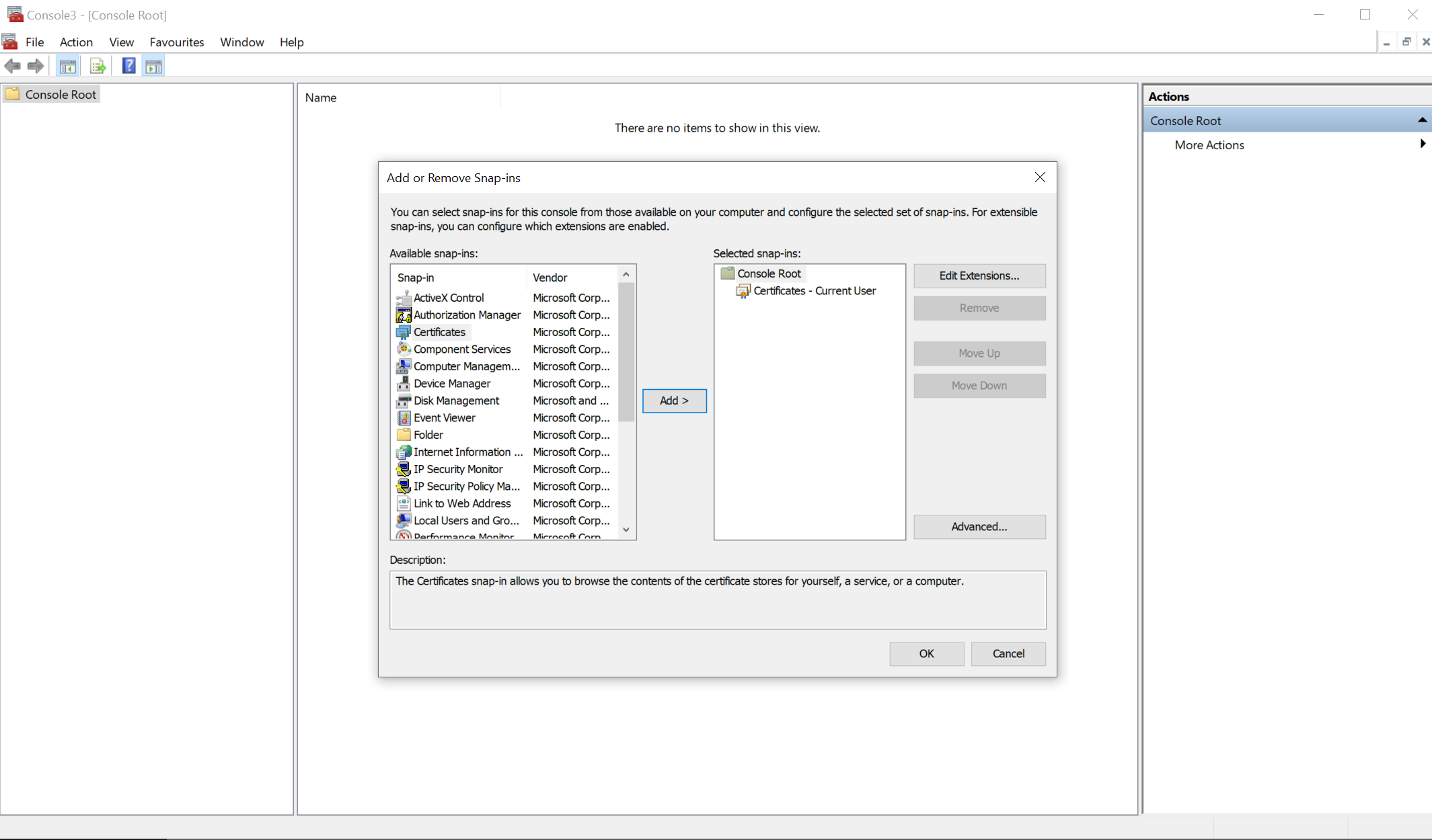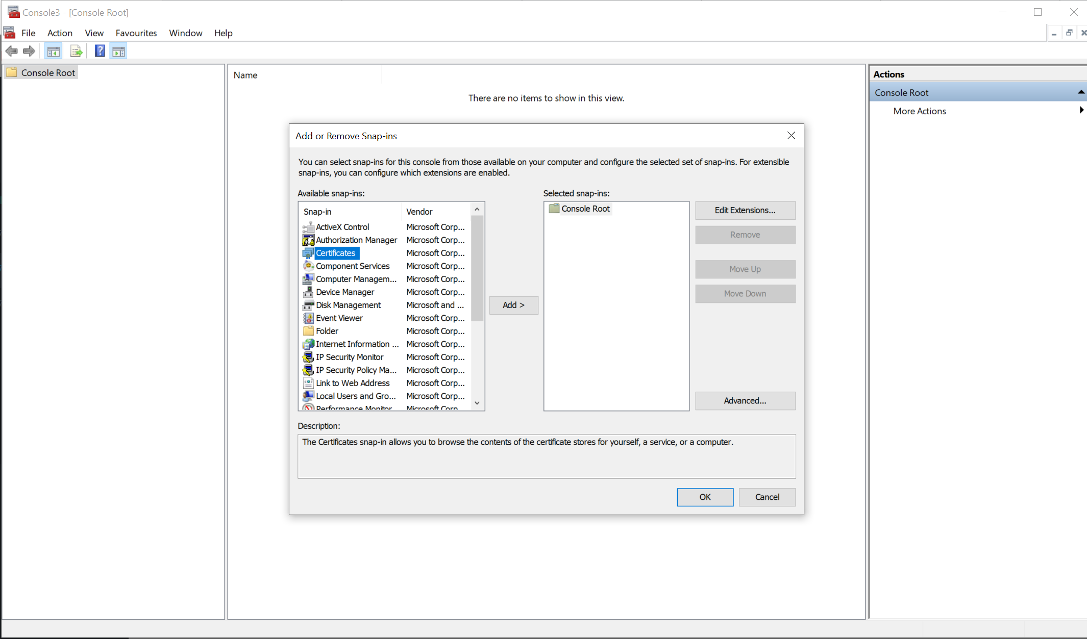 Sau đó sẽ hiển thị ra Certificates trên cửa sổ Add or Remove Snap-in cột bên phải: