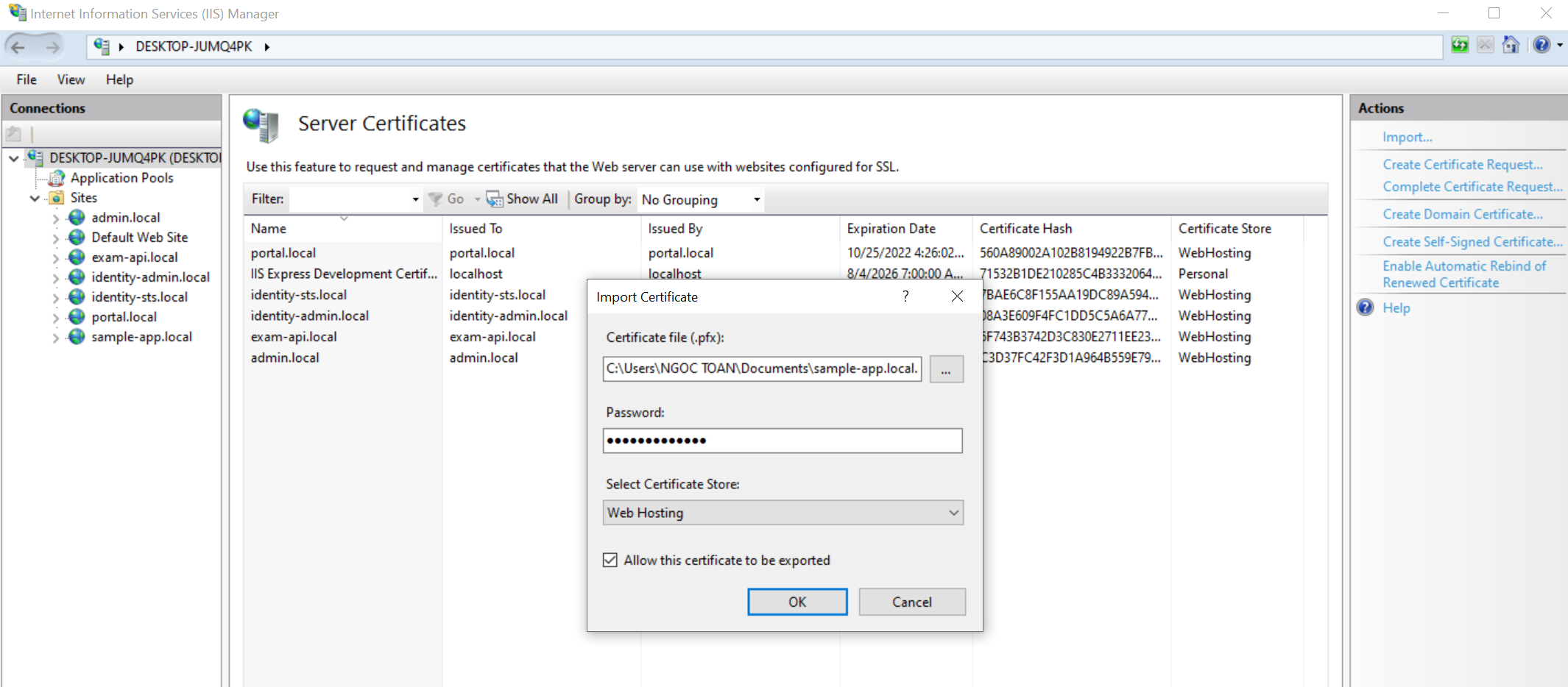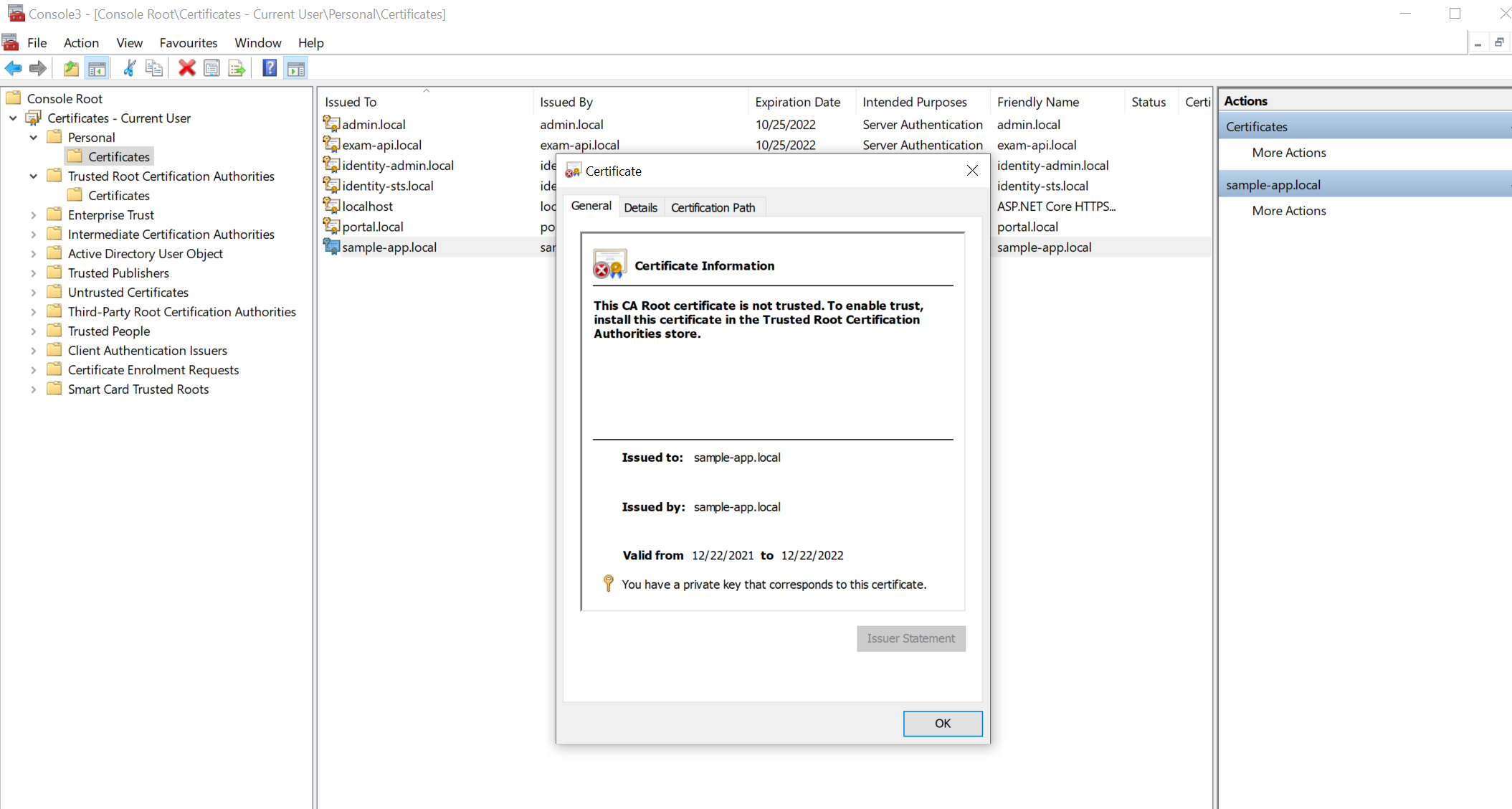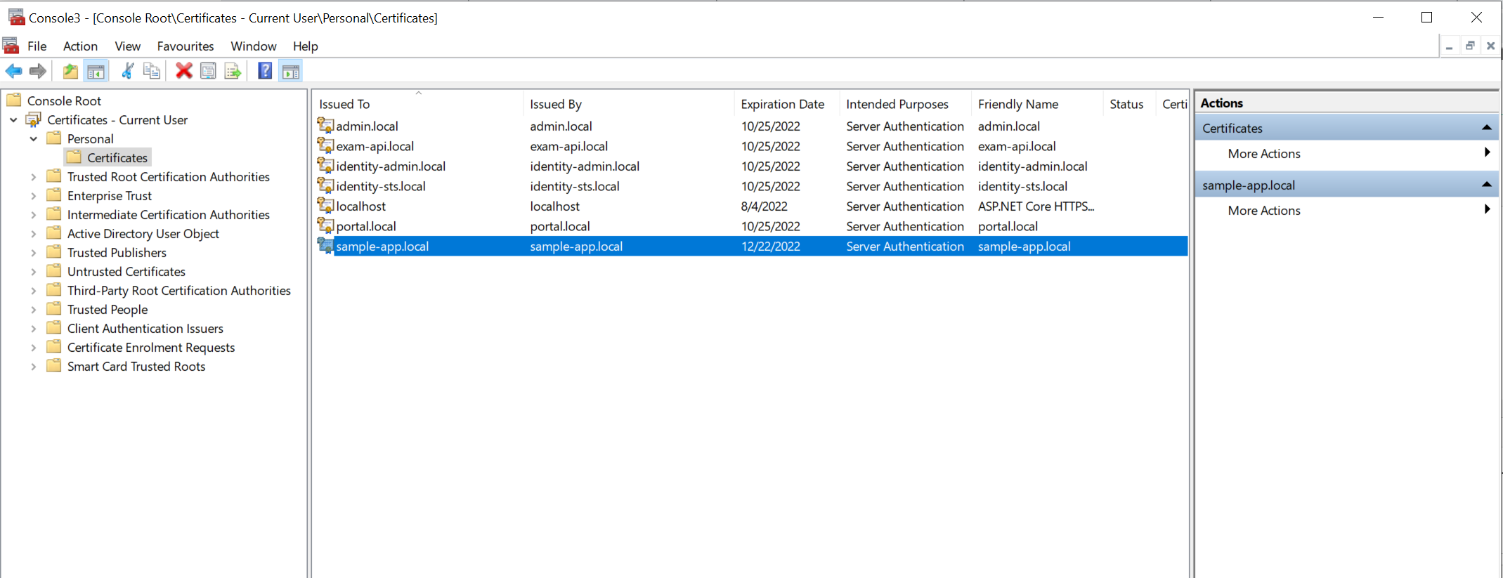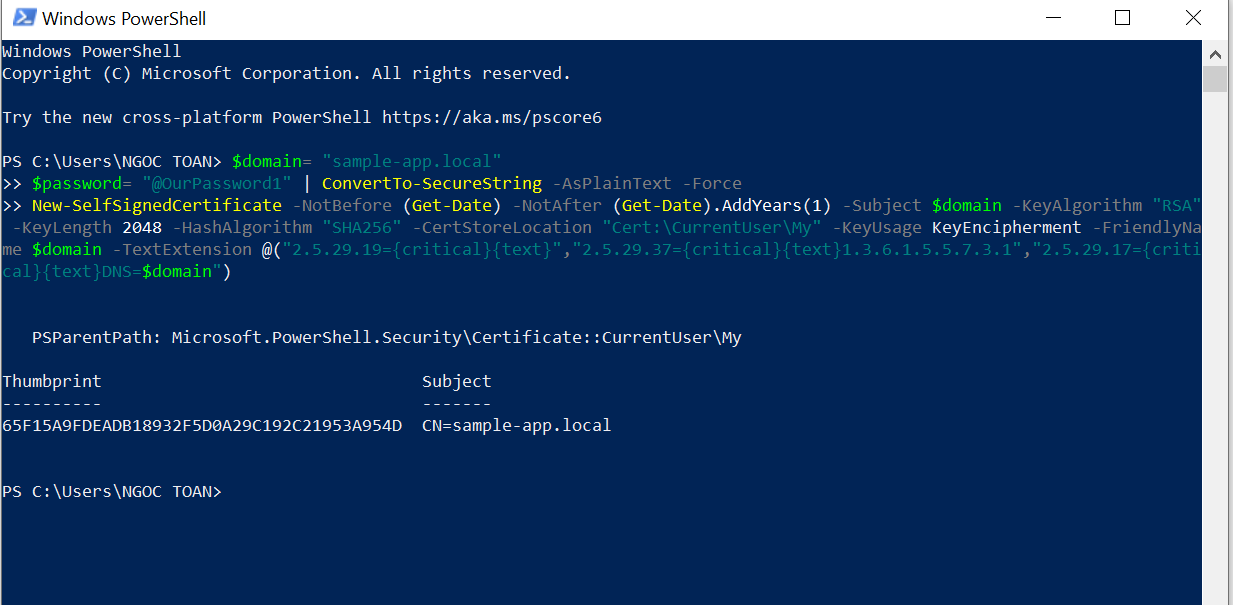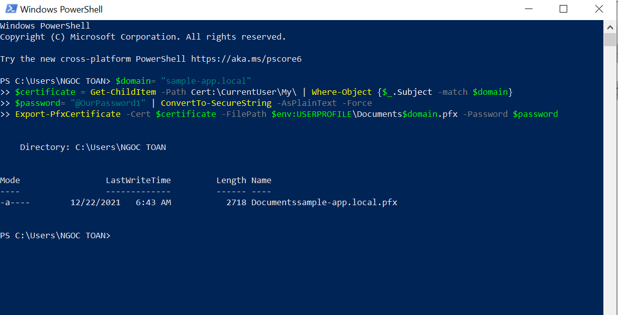 Bước này sẽ export ra file sample-app.local.pfx và xuất ra thư mục Documents của user hiện tại. Trong trường hợp bạn chạy lệnh tạo cert nhiều lần nó sẽ tạo ra nhiều file trùng domain nên câu lệnh này sẽ lỗi, bạn cần vào mmc để xoá đi. Cài này sẽ hướng dẫn trong bước 4.