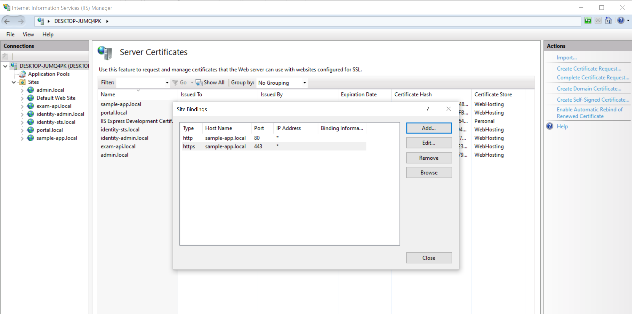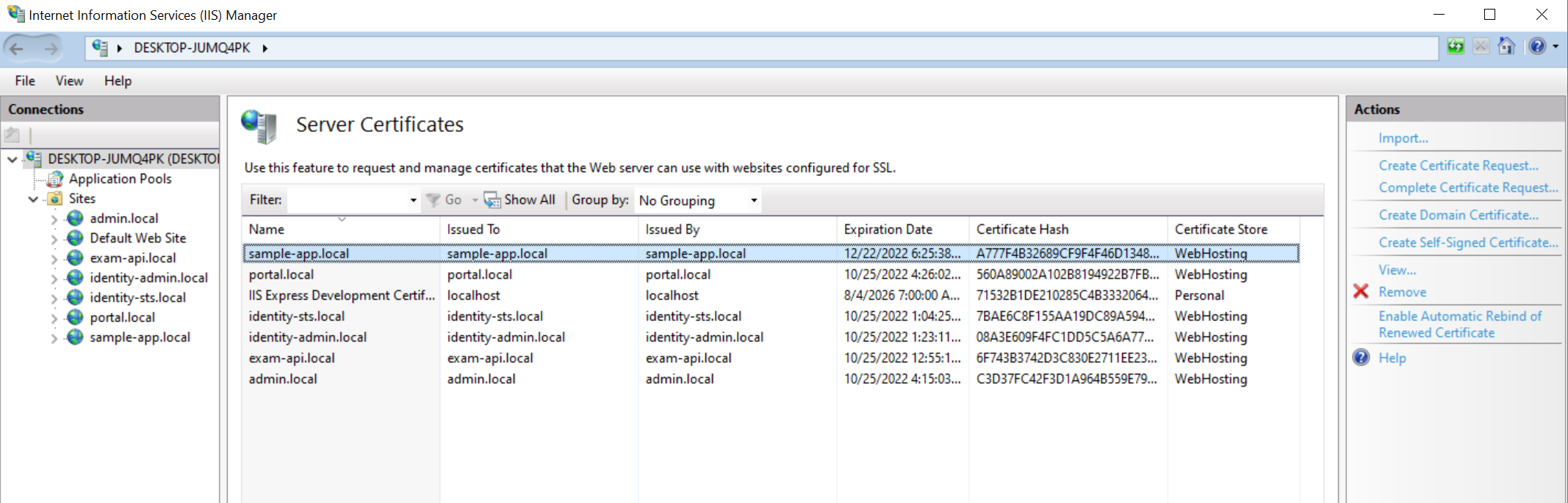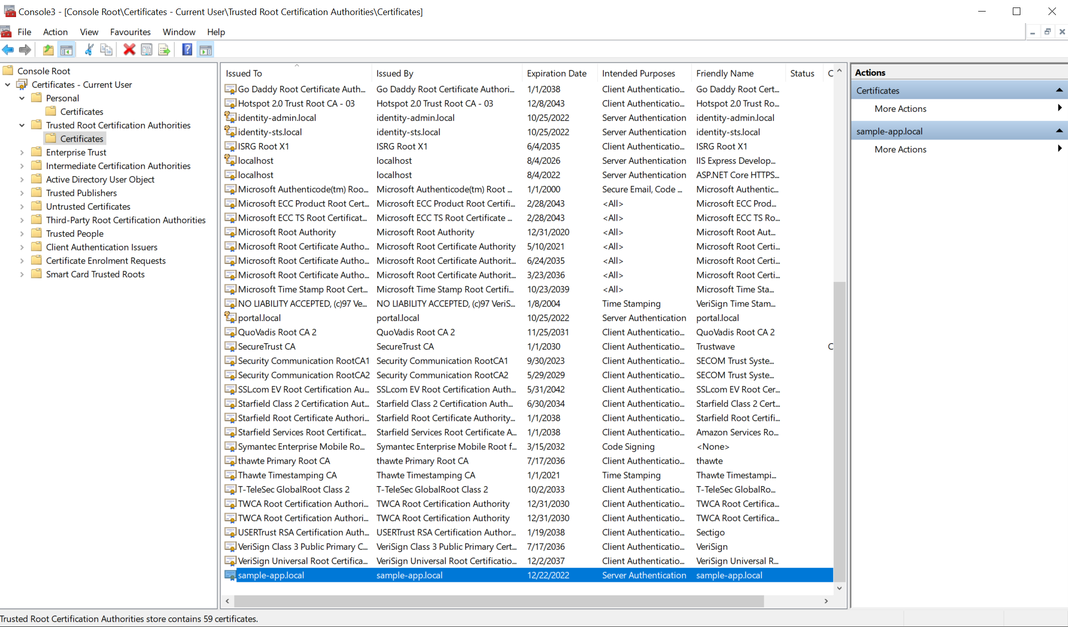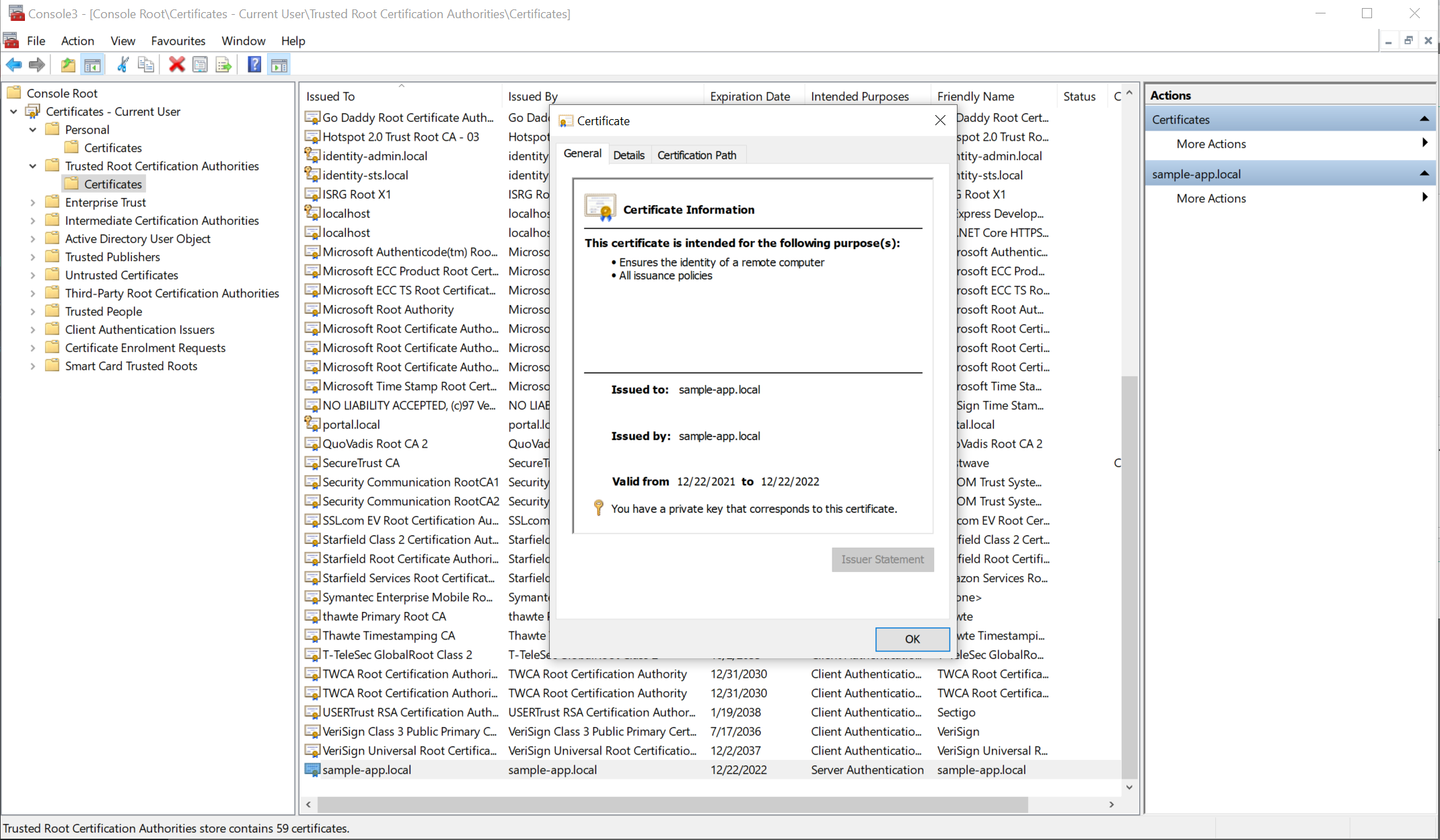Bước này sẽ export ra file sample-app.local.pfx và xuất ra thư mục Documents của user hiện tại. Trong trường hợp bạn chạy lệnh tạo cert nhiều lần nó sẽ tạo ra nhiều file trùng domain nên câu lệnh này sẽ lỗi, bạn cần vào mmc để xoá đi. Cài này sẽ hướng dẫn trong bước 4.
