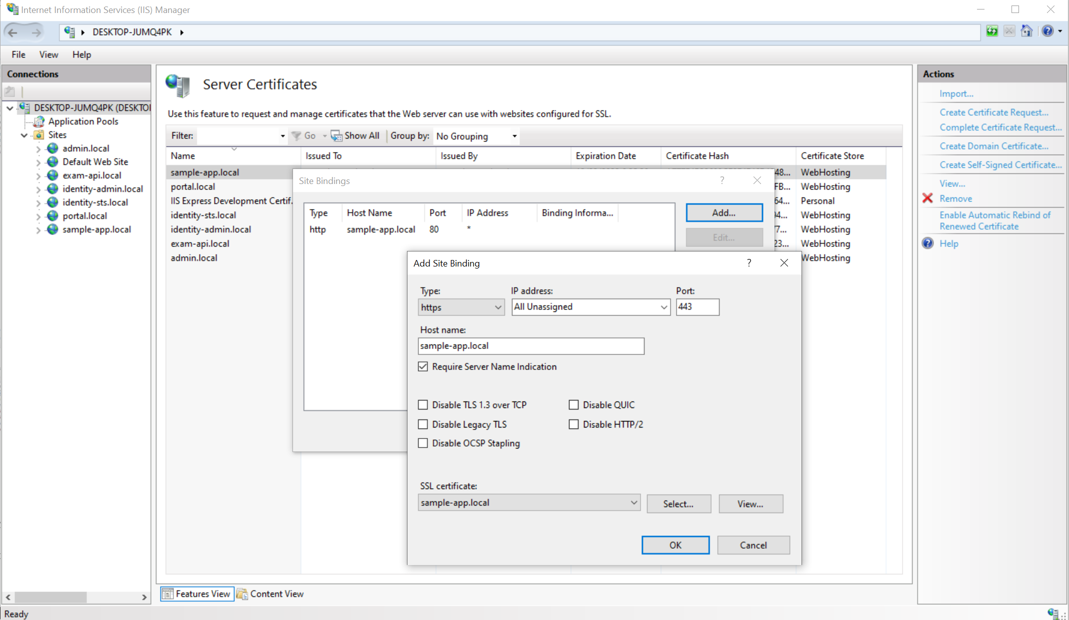 Sau khi xong bước 5 chúng ta bắt đầu Binding certificate vào website: