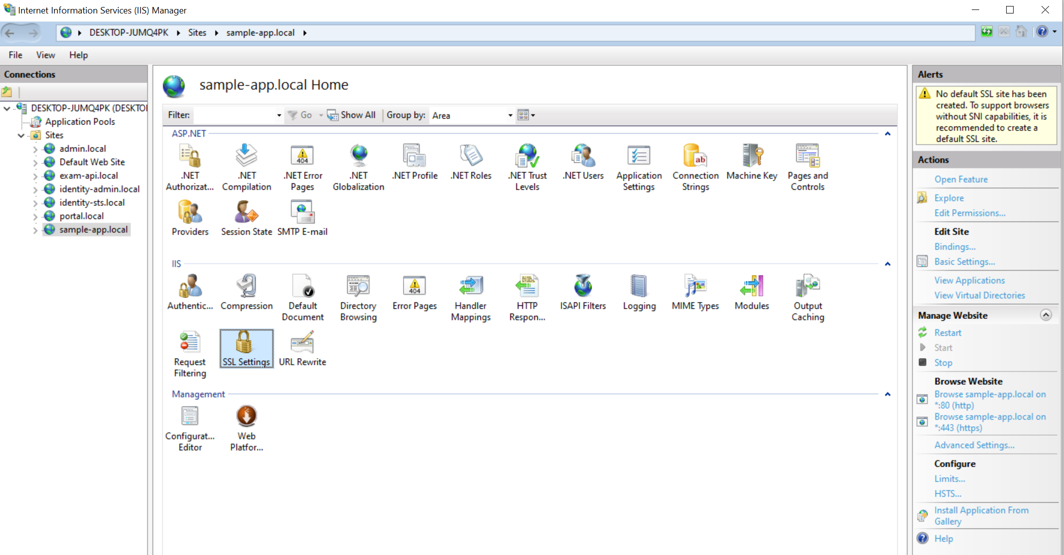 Cấu hình cho phép chạy SSL trên website của IIS, vào website chọn SSL Settings: