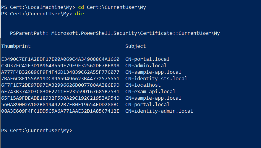 Một certificate sẽ được tạo ra trong thư mục CurrentUser\My trên tài khoản của bạn. Để xem bạn có thể gõ lệnh: cd Cert:\CurrentUser\My sau đó gõ lệnh dir để hiển thị các file trong thư mục:
