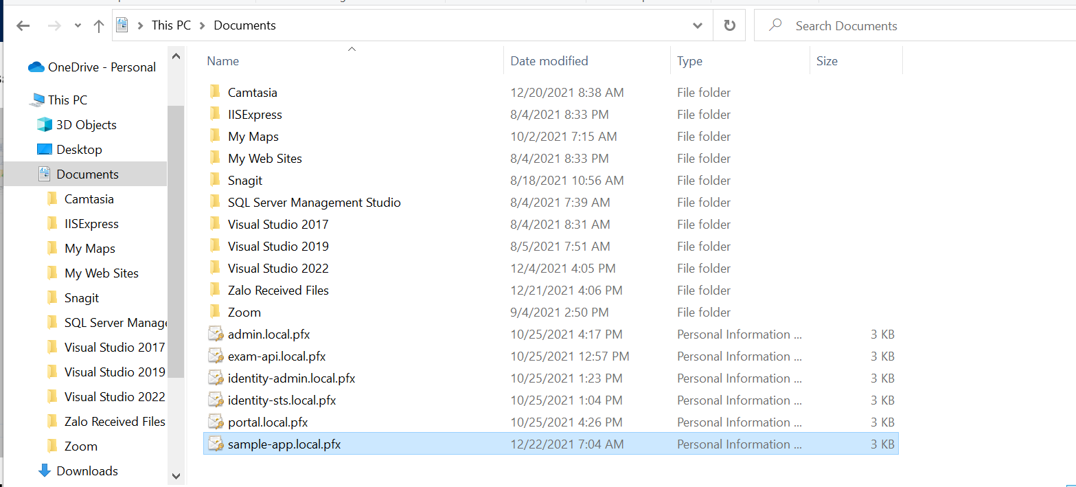 Vậy là vào phần My Documents chúng ta thu được file sample-app.local.pfx: