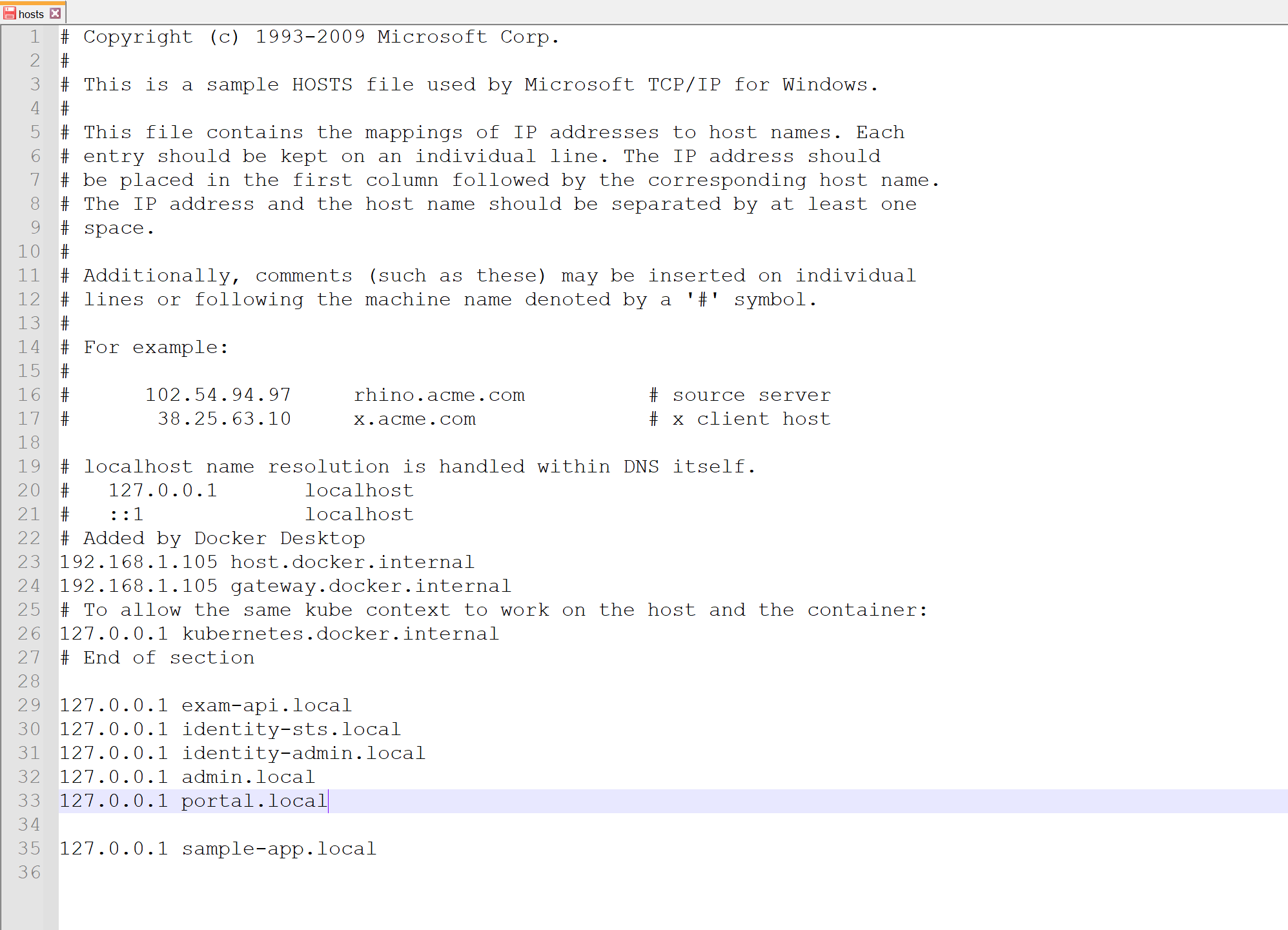 Vào file hosts ở vị trí C:\windows\System32\drivers\etc sau đó mở ở chế độ Administrator và điền domain custom của bạn, ở đây ví dụ là sample-app.local binding với địa chỉ IP 127.0.0.1 là IP đại diện cho máy hiện tại.